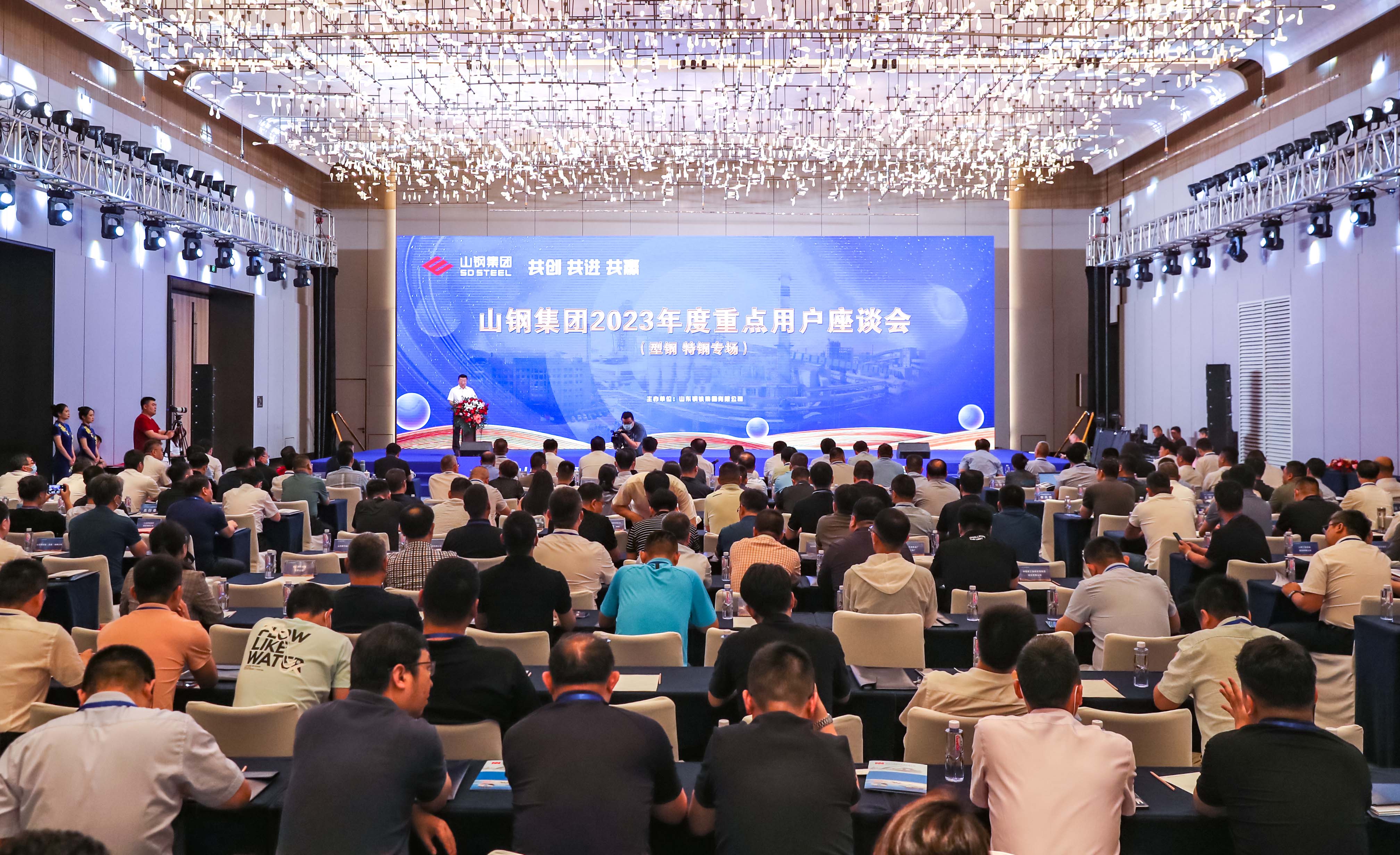 6月8日,抖音黑料 2023年度型钢特钢重点用户专场座谈会在济南召开。来自国内百余家钢铁行业的重点用户齐聚一堂,共商合作之计、共谋发展之策,共跨周期峰谷、共享生态繁荣,推动构建安全高效钢铁产业生态圈。会前,抖音黑料 党委书记、董事长侯军与部分用户进行座谈交流。会上,抖音黑料 党委常委、董事陈向阳,济南市钢城区委副书记、区长程学锋分别致辞。抖音黑料 副总经理,山钢股份党委书记、董事长王向东主持会议。