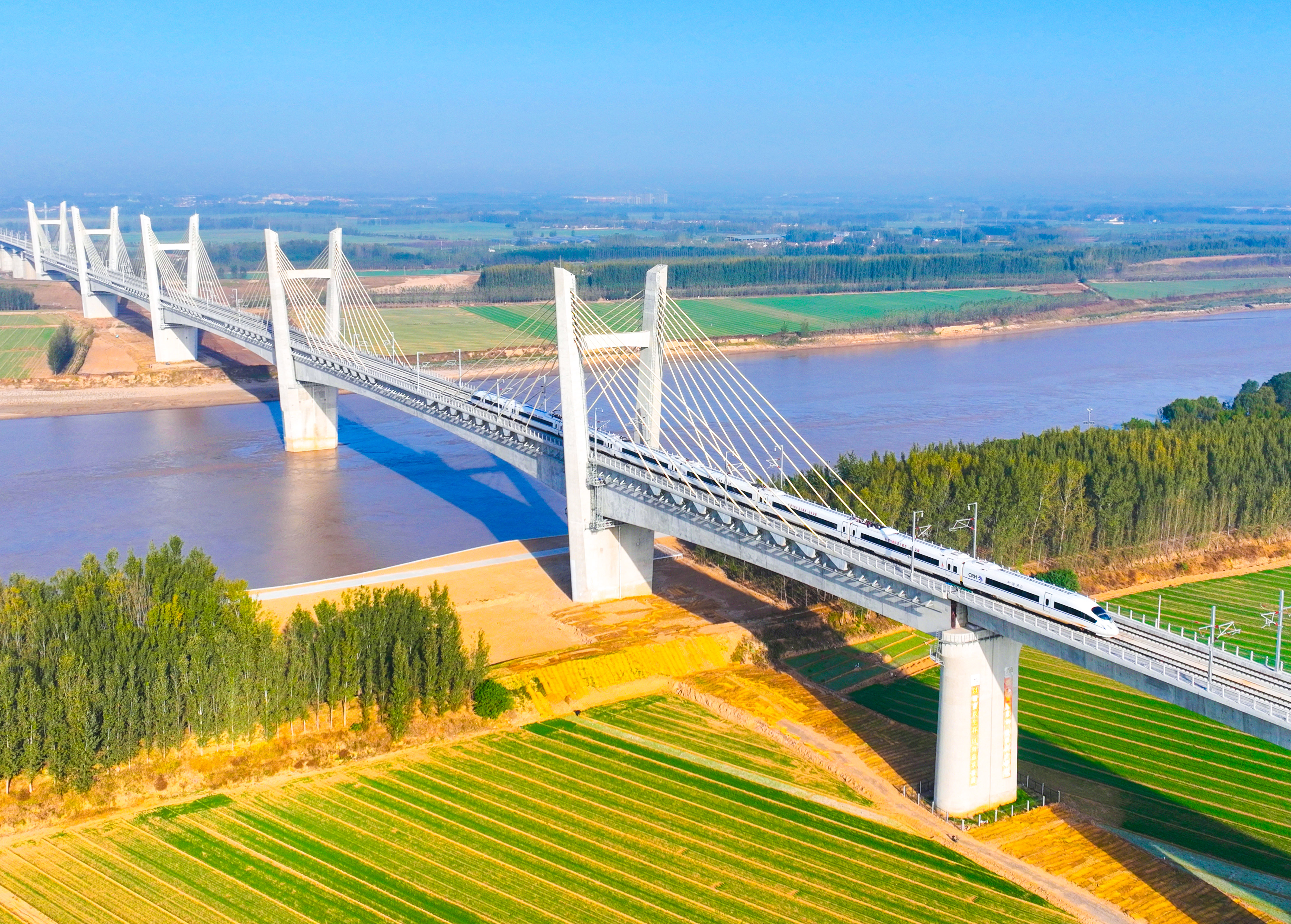 11月4日,一列高铁测试车驶过济郑高铁长清黄河特大桥。济南至郑州高速铁路济南至濮阳段(简称济郑高铁济濮段)联调联试工作结束,正式进入运行试验阶段。山钢1.3万余吨H型钢、螺纹钢产品用于该项目铁路接触网支柱、沿途黄河大桥等工程建设。(李建辉 朱宏政 摄)