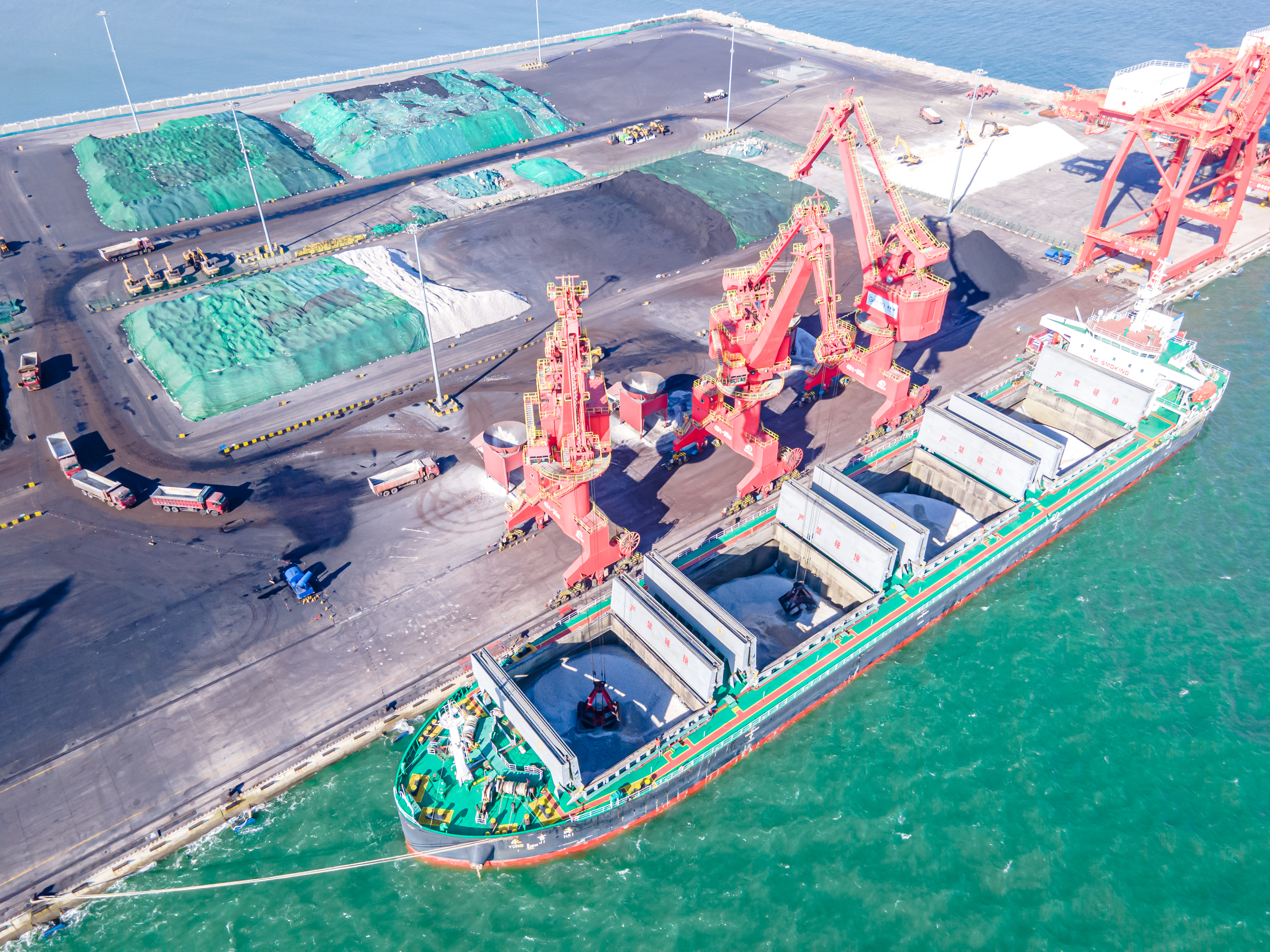 今年以来,山钢日照矿石采购协同支撑专项工作组充分借助宝钢股份“一中心多基地”机制的优势和经验,定期更新产线资源需求和供应时间节点,将资源缺口纳入整体平衡计划,提前策划澳矿、巴西矿装期计划,实现了采购成本的不断降低。图为山钢码头正在进行矿石接卸作业。 (郭 阳 摄)