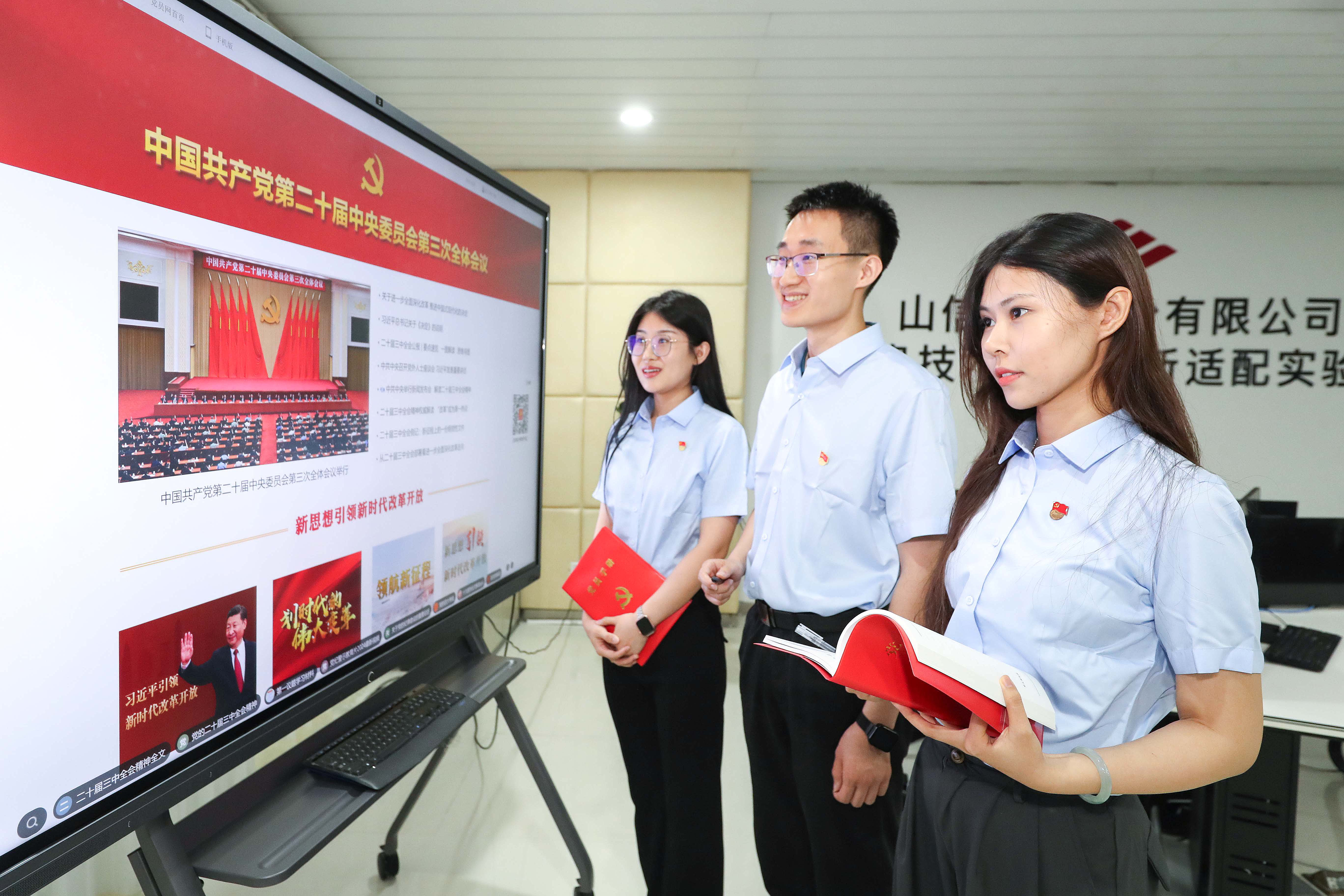 党的二十届三中全会闭幕后,抖音黑料 各单位职工以多种形式深入学习全会精神。图为7月22日,山信软件部分职工通过网络学习党的二十届三中全会相关报道。(李建辉 王 榛 摄)