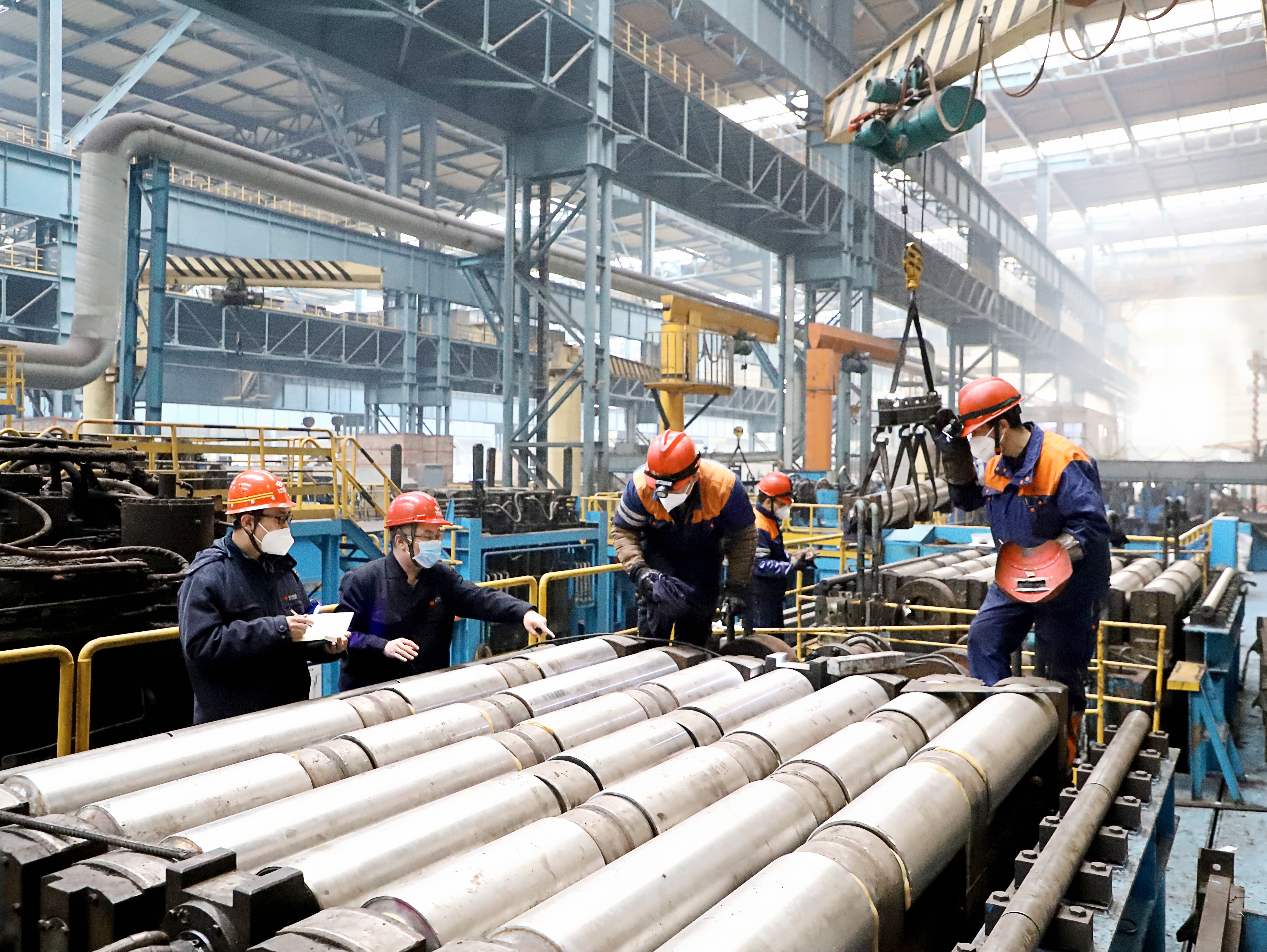 今年以来,面对严峻的市场形势,日照公司炼钢 厂从降本增效、稳产高产等方面入手,切实打造树牢 安全稳定、成本领先等8大优势,全力以赴推动日照 公司“争上游、走在前”。图为该厂职工正在开展连 铸机扇形段长寿命攻关。 (张兴伟 摄)